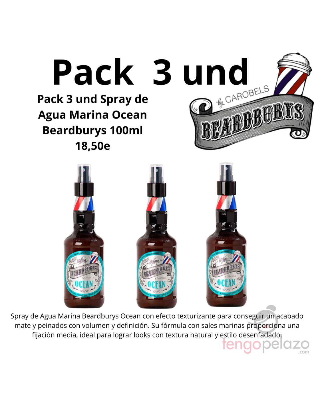 Textura y volumen con efecto surfero El Spray de Agua Marina Beardburys Ocean es un texturizante capilar formulado con sales marinas que aporta cuerpo, volumen y definición al cabello.