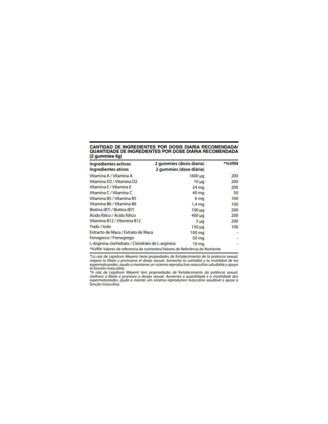 La raiz de Lepidium Meyenii tiene propiedades de fortalecimiento de la potencia sexual, mejora la libido y promueve el deseo sexual. Aumenta la cantidad y la motilidad de los espermatozoides, ayuda a mantener un sistema reproductivo masculino saludable y apoya la función masculina